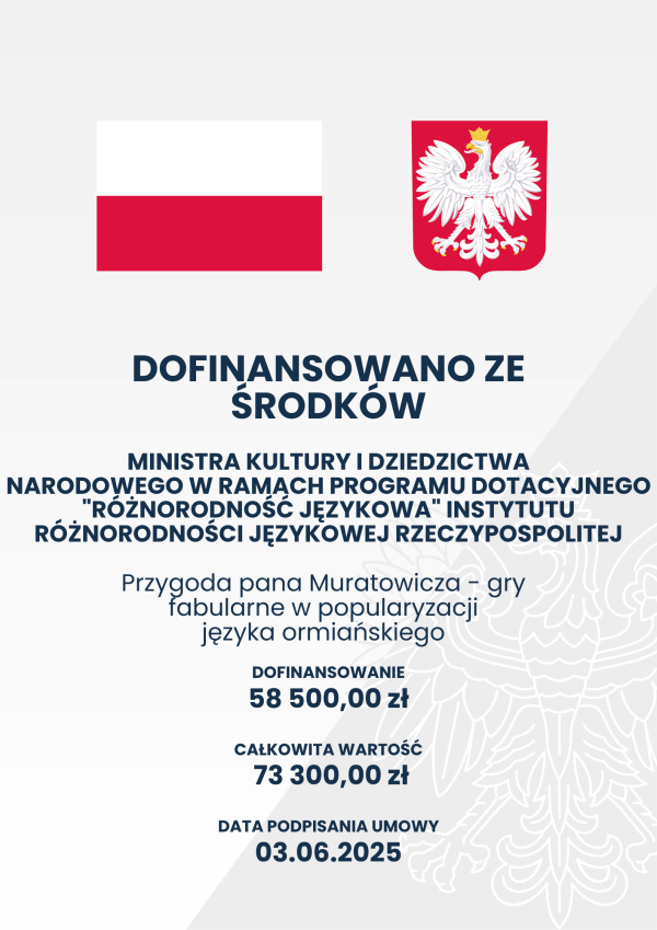Rozpoczynamy realizację naszego najnowszego projektu pn. Przygoda pana Muratowicza - gry fabularne w popularyzacji języka ormiańskiego. Polega on na wykorzystaniu gier fabularnych (RPG) w popularyzacji języka ormiańskiego i przybliżania kultury polskich Ormian. Zachęcamy do śledzenia na naszych mediach społecznościowych poszczególnych etapów realizacji projektu. Już 31 maja będziemy mieli pierwsze spotkanie :)